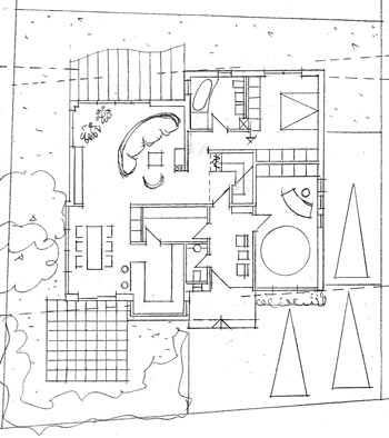 Die ABSAGE kam so zustande, dass mich Freunde beauftragten, für sie ein Haus zu bauen, zu dem sie mir Lageplan und Raumprogramm lieferten. Dies war das Ergebnis, als Erstentwurf und als Ergebnis, das eingereicht werden sollte.